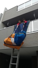 マッサージチェアをご友人宅から運搬し、3階建て一軒家の2階ベランダから吊り上げました。